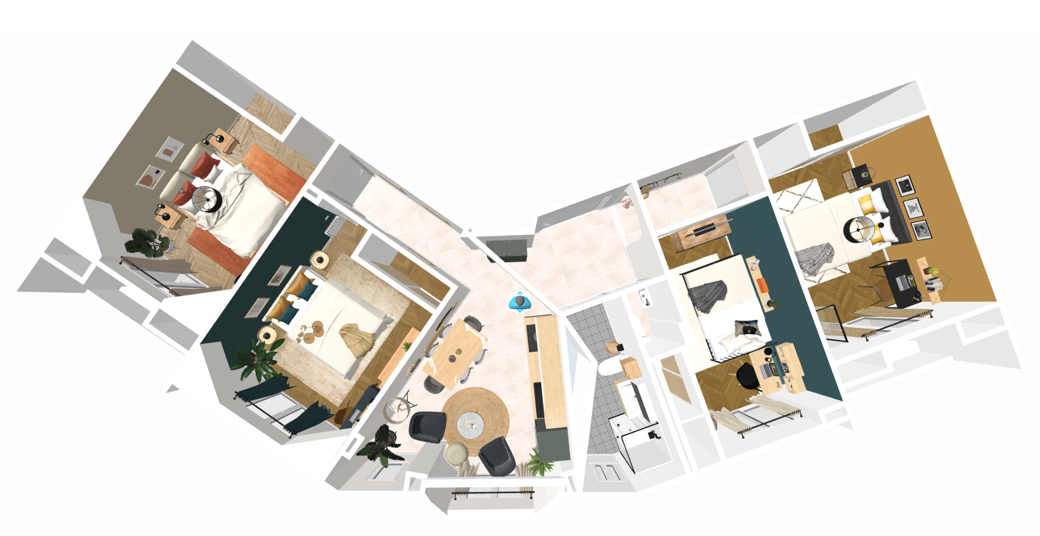Le projet : Mme. P. a investi dans un appartement à repenser intégralement afin de proposer 4 chambres (initialement 3) sans sacrifier la fonctionnalité et l’harmonie du lieu.