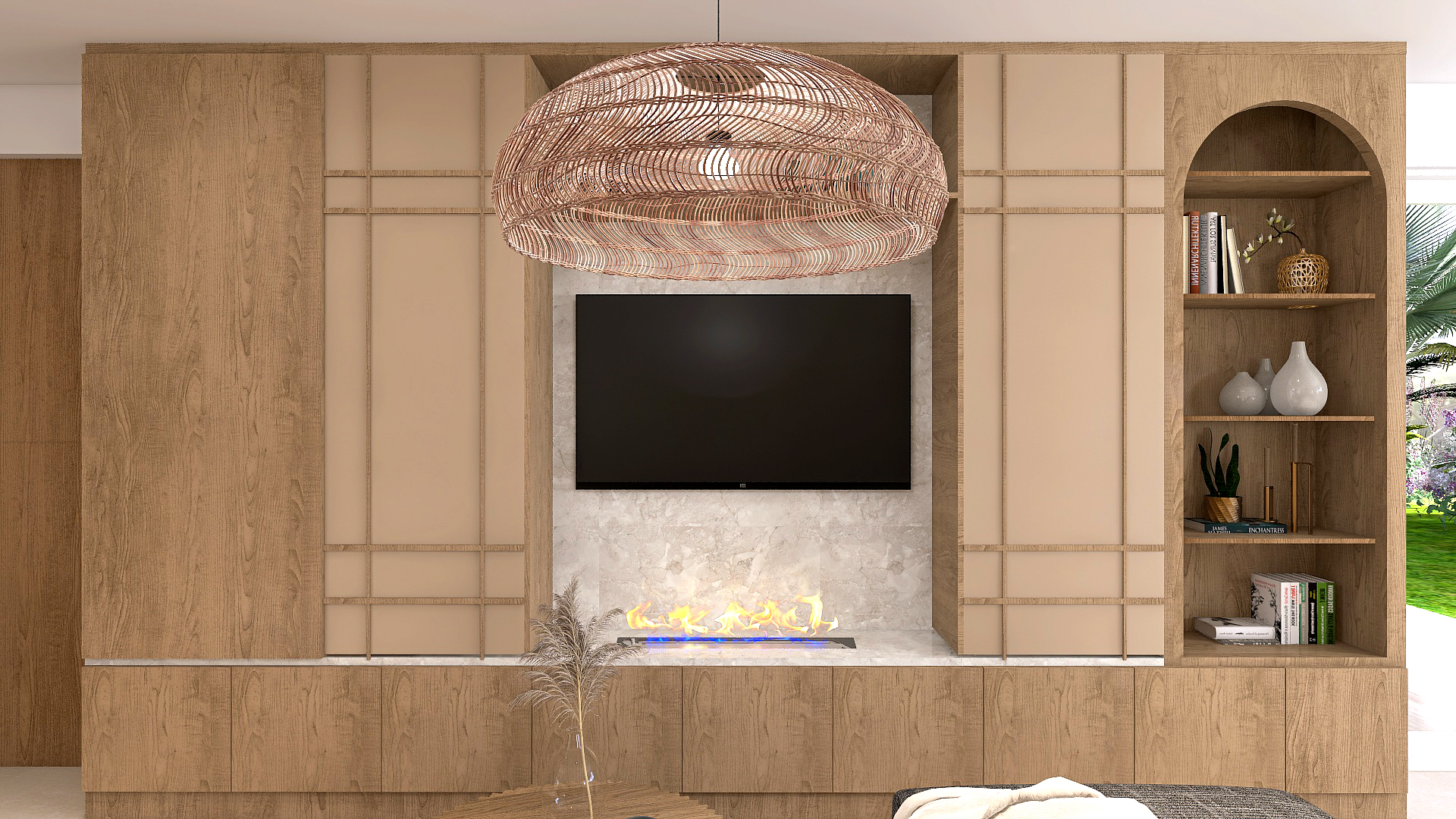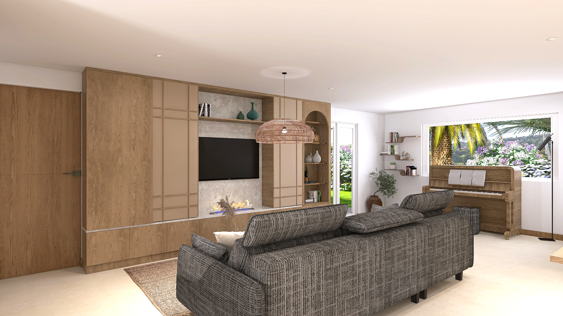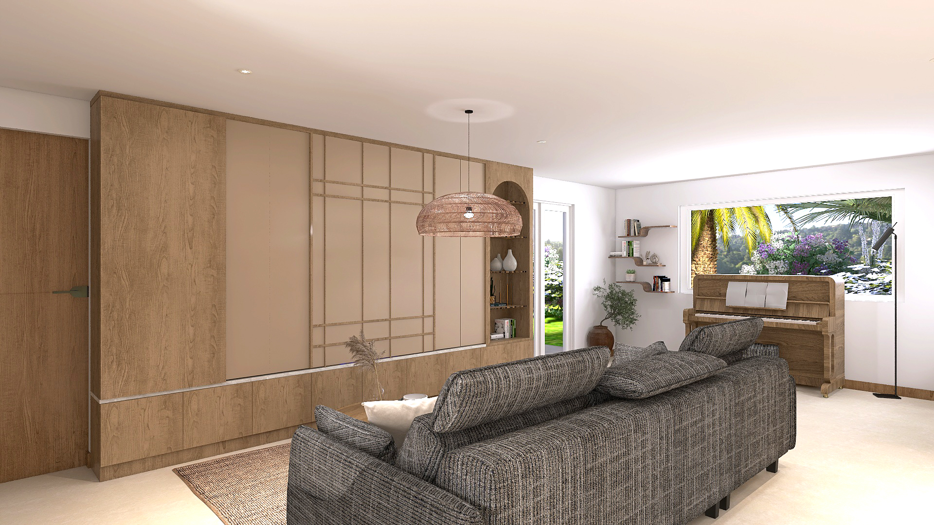 – un salon avec un grand meuble sur mesure